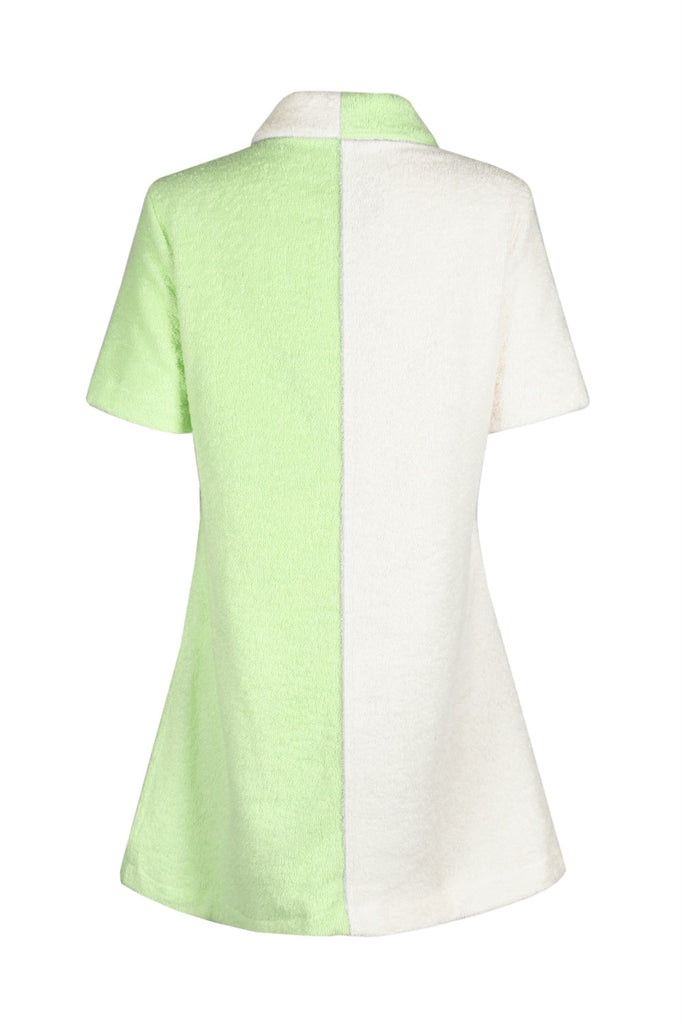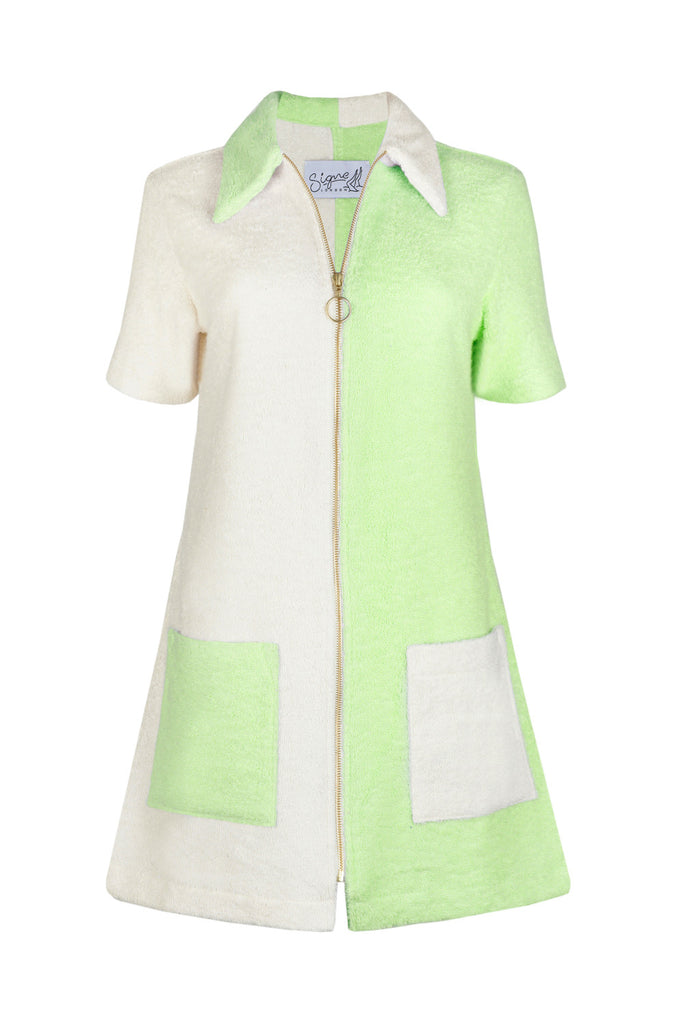The ring pull gold zip is an added detail we love, connecting the greem and the cream for a show stopping look.